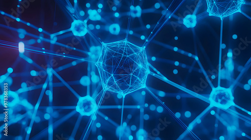 Abstract holographic plexus shapes in blue, suspended in a virtual environment, connected by neon blue