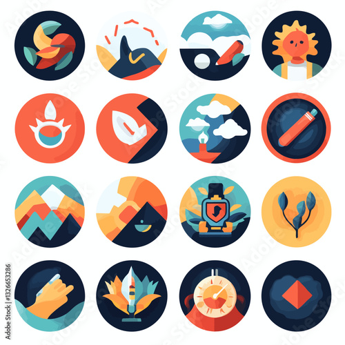 abstract, icon, set, nature, environment, mountain, cloud, sun, flames, leaf, design, industry, technology, clock, compass, graphic, illustration, circle, symbol, minimalist, colourful, modern, template, creative, decorative, element, concept, shape, art, vector, isolated, signs, style, background, collection, business, innovation, eco, sustainability, energy