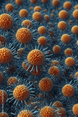Abstract illustration of a virus or microscopic organism with intricate details and vibrant colors against a dark background