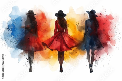 Abstract illustration of three women walking, depicted through a blend of watercolor and bold strokes