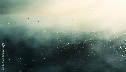 abstract, landscape, misty, dark, particle, floating, mystery, depth, moody, atmospheric, texture, background, design, art, grunge, dark green, teal, grey, light, dust, fog, smoke, environment, nature, serene, calm, peaceful, whimsical, enigmatic, aethereal, dreamlike, fantasy, pattern, wallpaper, graphic, digital artwork, illustration, overlay