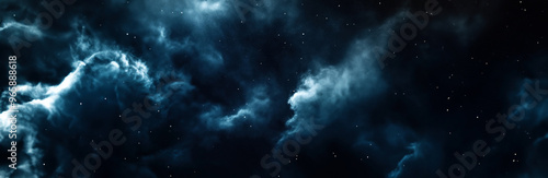 Abstract image of a deep space nebula with interstellar clouds of gas and dust, surrounded by stars in a dark blue and black cosmic background.