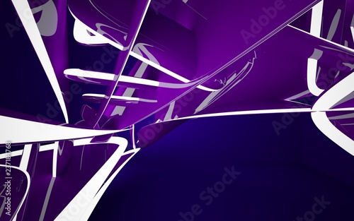 Abstract interior of the future in a minimalist style with violet violet sculpture. Night view from the backligh. Architectural background. 3D illustration and rendering