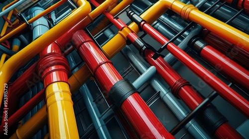 pipe, red, yellow, blue, metal, abstract, industrial, pattern, grid, interlocking, design, texture, shiny, smooth, glossy, colourful, vibrant, geometric, shape, line, angle, structure, network, connection, system, background, graphic, modern, contemporary, architecture, engineering, mechanical, machinery, futuristic