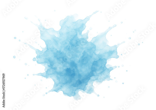 Abstract light blue watercolor splash with small droplets.