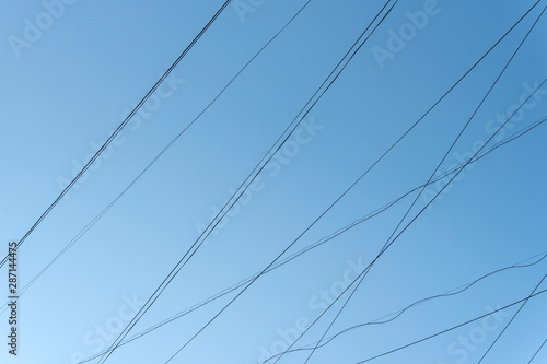 Abstract Lines of electric Cables Wires with blue Sky in City