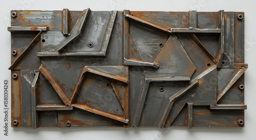 Abstract metal wall relief dark grey rusted with geometric shapes and bolted construction