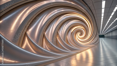 Abstract metallic tunnel with swirling design and modern architectural elements