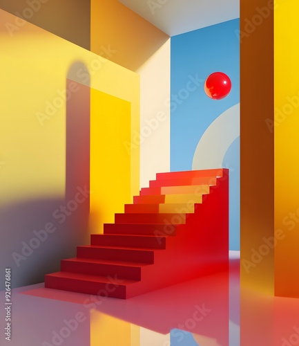stair, red, yellow, minimalism, interior, design, architecture, abstract, three-dimensional, rendering, geometric, shape, modern, contemporary, art, illustration, digital, background, wall, colours, light, shadow, space, room, style, gradient, sphere, floating