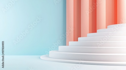 abstract, minimalist, staircase, step, stair, platform, dais, pedestal, round, circular, blue, light blue, sky blue, turquoise, peach, coral, orange, pink, pastel, soft, light, background, design, modern, contemporary, clean, simple, geometric, shape, form, product, display, presentation, three-dimensional, rendering, studio, branding, interior, decoration, art, graphic, pattern