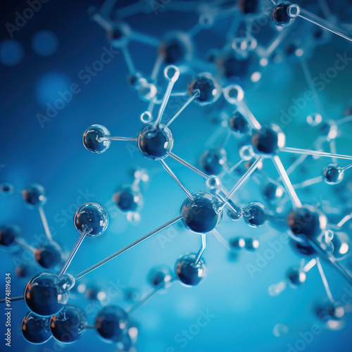 Abstract Molecular Structure: A captivating close-up of a molecular structure, rendered in a 3D style against a serene blue backdrop, highlighting the intricate connections and bonds within the micro