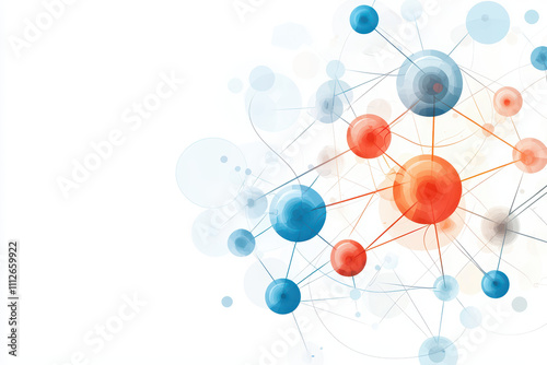 Abstract molecular structure with colorful nodes and connections, showcasing blend of blue, red, and transparent elements on white background, creating modern and scientific aesthetic