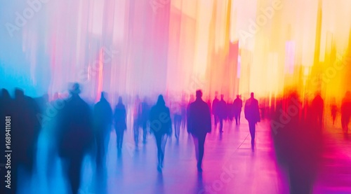 Abstract motion blur of people walking on a city street at night, illuminated by vibrant neon lights, symbolizing loneliness and metropolitan life.