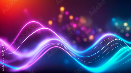 Abstract neon wave lines, bokeh lights, data transmission concept