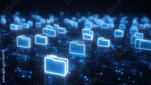 Abstract network grid with files and folders, futuristic software interface, digital document management system, store, search and organize documents, corporate business, paperless office