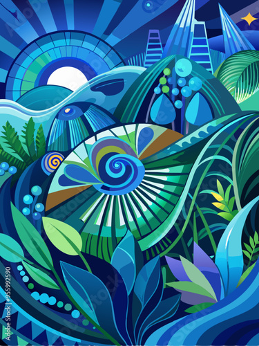 blue, green, night, landscape, abstract, shape, geometric, design, art, illustration, background, pattern, texture, stylised, modern, contemporary, graphic, digital, vibrant, bold, colourful, whimsical, organic, nature, foliage, leaf, flower, spiral, circle, line, curve, sky, moon, star, city, building, tower, fantasy, dream, surreal, mystical, artistic, creative, expressive