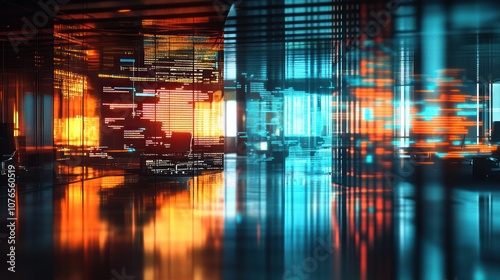 office, interior, neon, light, futuristic, technology, glasses, window, modern, design, abstract, architecture, space, workspace, digital, code, datum, network, web, cyberspace, programming, computer, science, tech, future, innovation, virtual, reality, bright, colourful, style, minimal, clean, geometric, line, pattern, shape, structure, glow, dark, night, night time, illuminated, glossy, shiny