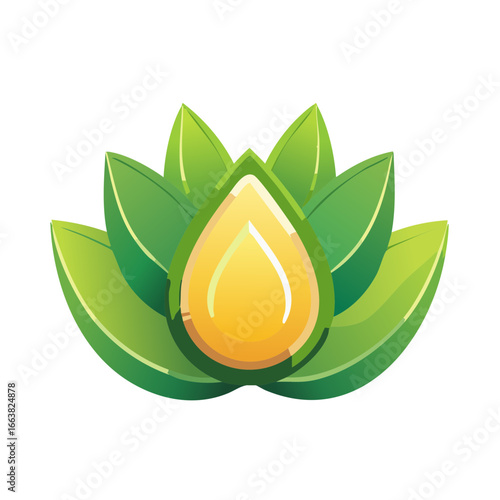 Abstract Oil Drop Surrounded by Green Leaves, Vector Illustration, Natural and Healthy Concept, Spa Logo Symbol