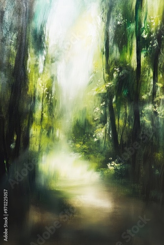 abstract, oil, painting, blurred, forest, landscape, dense, foliage, nature, tree, artistic, vibrant, green, texture, contemporary, botanical, scene, moody, impressionism, tranquil, outdoors, natural, element, colourful, soft, atmosphere, creative, artwork, serene, detail