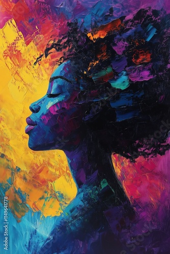Abstract Oil Painting of African Woman in Vibrant Fuchsia, Turquoise, Yellow, and Deep Violet Colors