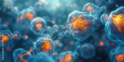 Abstract Orange Glowing Cells Connected by Light Strands in a Vibrant Blue Microscopic Environment