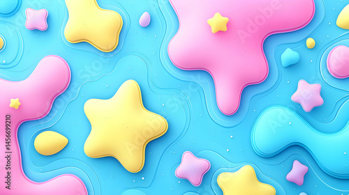 abstract, background, pink, yellow, blue, star, blob, shape, colours, pattern, design, pastel, three-dimensional, texture, geometric, modern, art, graphic, creative, illustration, visual, composition, colourful, smooth, liquid, abstract art, swirl, fluid, trendy, digital artwork, graphic design, decorative, whimsical, playful, aesthetic, minimalist, contemporary, pop art, art nouveau, cute, children, children, fun, happy