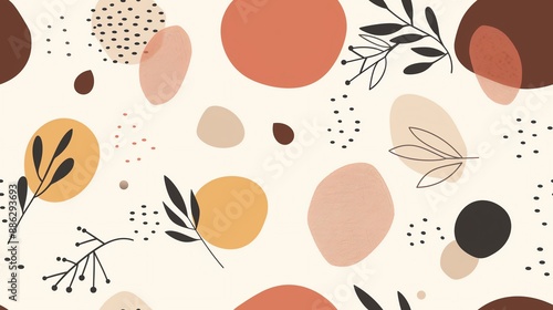 Abstract pastel pattern with organic shapes, dots, and botanical elements in earth tones. Seamless design for backgrounds and textiles.