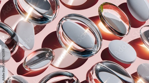 pill, capsule, oval, round, semitransparent, clear, white, pink, background, shadow, light, geometric, pattern, three-dimensional, render, abstract, medicals, pharmacy, health, beauty, cosmetic, product, display, design, modern, shape, floating, glossy, shiny, high-quality, illustration, visual, composition, realistic, glimmer, branding, studio, bright, elegant, sophisticated, aesthetic