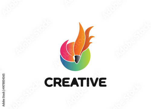 Abstract pencil logo with colorful flame shapes, symbolizing creativity and innovation. Perfect for design studios, art brands, or agencies.