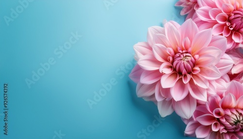 Abstract Pink Dahlia Patels on Pastel Blue Background. Spring Flower on Pastel Blue Background. Valentine's Day, Birthday, Happy Women's Day, Mother's Day Banner. With copy space.
