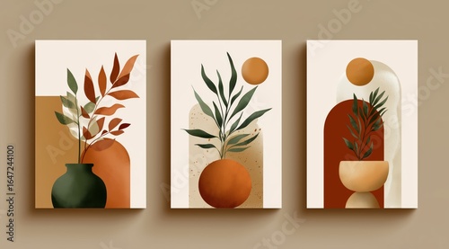 Abstract Plant Art: A collection of abstract art pieces showcasing botanical themes, featuring minimalist designs and warm color palettes, evoking a sense of calm and modern aesthetic appeal.