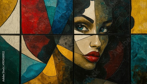 woman, portrait, abstract, art, painting, face, eye, lip, hair, black, blue, green, yellow, red, white, cracked, texture, canvas, contemporary, modern, style, expressive, bold, colourful, vibrant, beauty, feminine, mysterious, intriguing, gaze, intense, emotion, feeling, mood, composition, cleaving, panel, multiple, section, artwork, masterpiece, gallery, exhibition