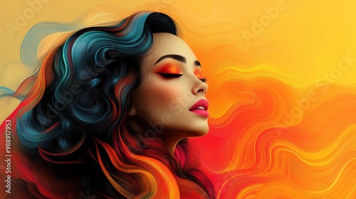 woman, female, portrait, hair, fantasy, colourful, abstract, art, digital artwork, surreal, design, illustration, beauty, fashion, style, dream, vibrant, bright, colours, graphic, rainbow, background, texture, pattern, hallucinogen, magical, mystical, sparkle, glowing, light, eye, closed eyes, face, profile, make-up, lip, coiffure, long hair, wavy hair, flowing, head, head shot