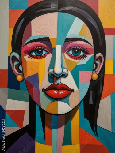 abstract, portrait, woman, colourful, geometric, shape, art, modern, style, face, eye, hair, blue, yellow, orange, red, pink, green, purple, white, painting, canvas, graphic, design, illustration, contemporary, artistic, vibrant, bold, bright, expressive, unique, creative, dynamic, composition