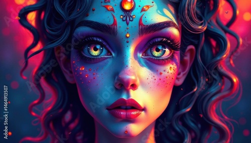Abstract psychedelic visage; bright colors, playful shapes, hints of horror , design, surreal, vibrant colors
