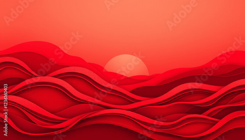 Abstract red wavy background with a glowing sunset and smooth flowing lines creating a warm and vibrant landscape, perfect for digital designs and artistic compositions.