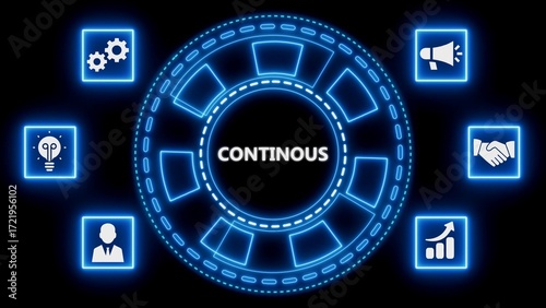 continuous, process, business, concept, workflow, innovation, strategy, technology, digital, circle, neon, glowing, light, illustration, diagram, infographic, idea, teamwork, marketing, growth, development, gear, handshake, promotion, graph