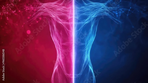 Abstract representation of duality in human form, showcasing vibrant colors and ethereal energy flows.
