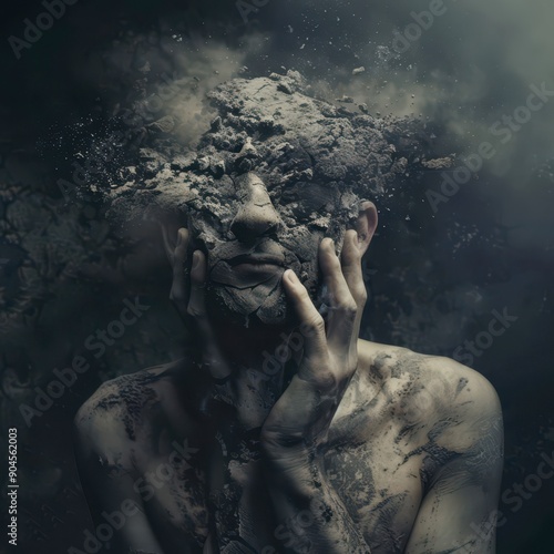 human, emotion, dust, erosion, abstraction, figure, darkness, introspection, texture, light, atmosphere, expression, tumult, hand, face, disintegration, debris, sculpture, identity, surrealism, creativity, form, contrast, solitude, space, energy, movement, condition, nature, environment, fragility, existence, surreal, art, mood, chaotic, transformation, organic, design, mental, state, beauty, body