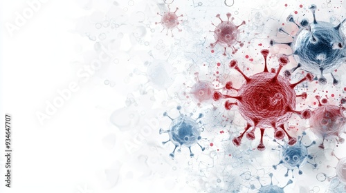 Abstract representation of virus particles in red and blue, symbolizing health and medical themes, with a soft background.