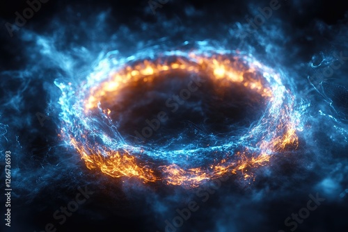 abstract, ring, energy, circle, particle, orange, blue, glowing, light, dark, background, swirling, digital, art, illustration, design, pattern, texture, modern, contemporary, futuristic, creative, colourful, visual, technology, imagination, motion, effect, graphic, painting, three-dimensional, rendering, computer, graphic, particle, colours, fire, geometric
