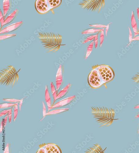 background, pomegranate, pattern, watercolor, seamless, gold, leaf, tropical, print, abstract, repeat, blue, decorative, illustration, vector, vintage, nature, texture, decoration, leaf, art, wallpaper, design, colourful, drawn, fruit, floral, textile, exotic, fabric, cardboard box, plant, ruby, fragrant, season, delicious, product, retro, botanical, vegetarian, collection, summer, sweet, vignetting, half, healthy, graphic, juicy