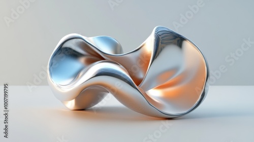 Abstract Shiny Metallic Sculpture with Fluid Form on White Background.