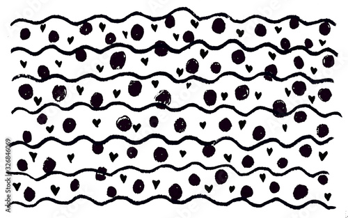 Abstract simple cool background with waves, hearts, rounds, points, zigzag stripes, lines, dry brush strokes. Hand drawn hipster design