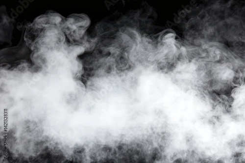 Abstract smoke clouds against black background. Dense, white plumes of vapor