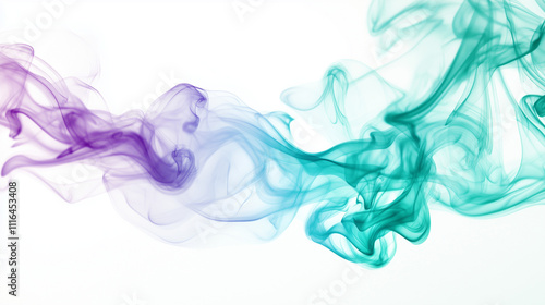 Abstract smoke pattern in emerald and violet on a clean white backdrop, abstract colourful smoke.