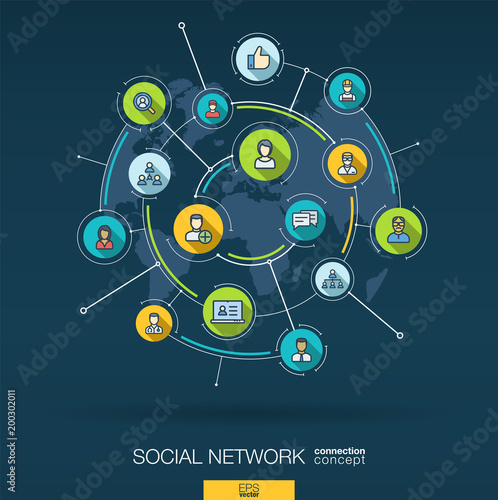 Abstract social network background. Digital connect system with integrated circles, flat thin line icons, long shadows. Network interact interface concept. Vector infographic illustration