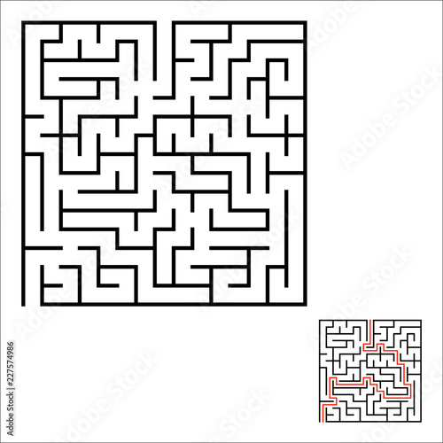 Abstract square maze. Game for kids. Puzzle for children. One entrances, one exit. Labyrinth conundrum. Simple flat vector illustration isolated on white background. With answer.
