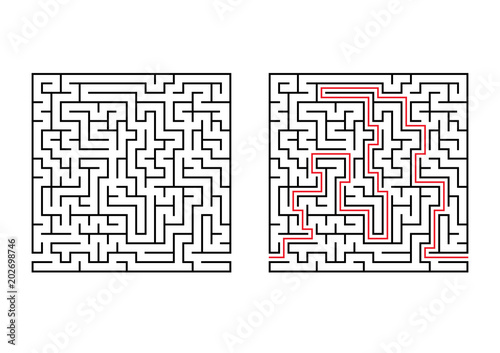 Abstract square maze. Simple flat vector illustration isolated on white background. With the answer.