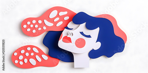 Abstract stylized female woman face in a paper cut style with blue, red and white colors.